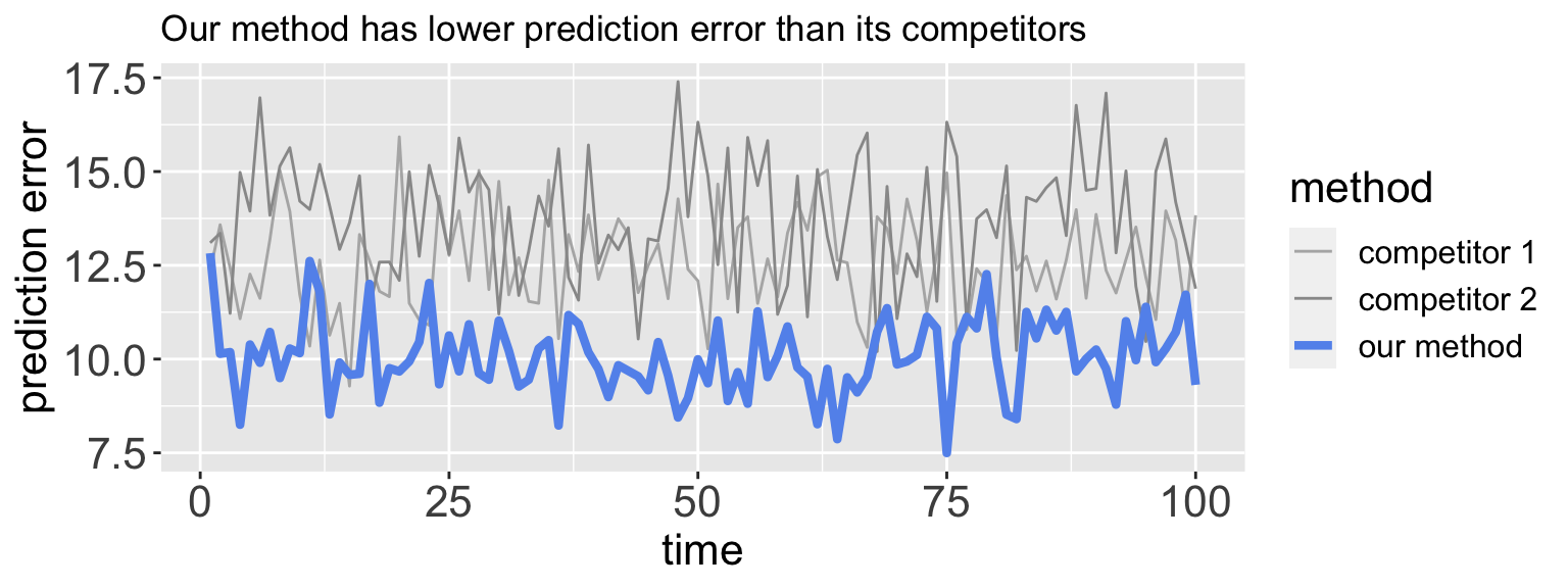 • make an informative slide header with the take-away message that “our method has lower prediction error than the competitors”.