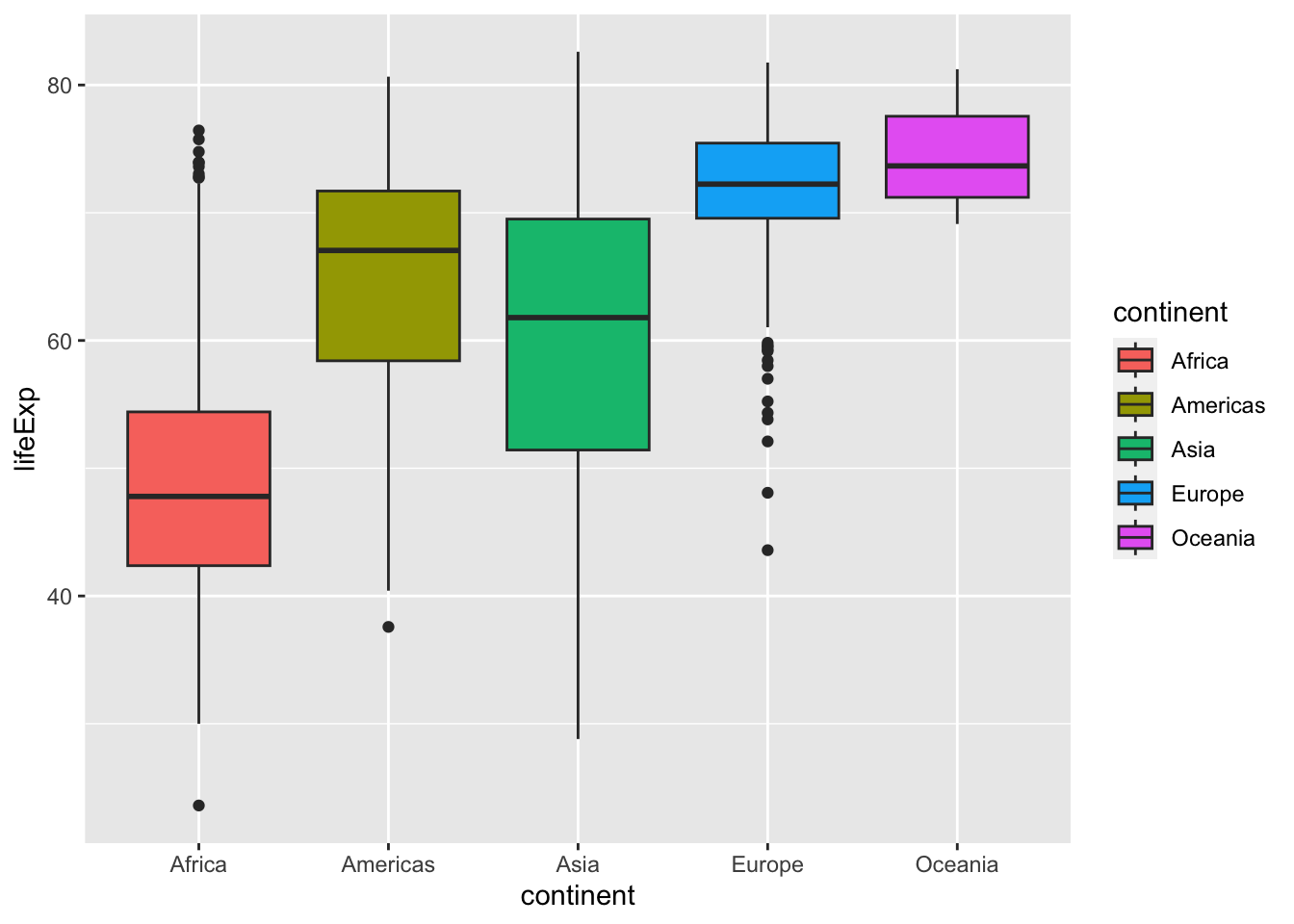ggplot(gapminder, aes(x = continent, y = lifeExp, fill = continent)) +