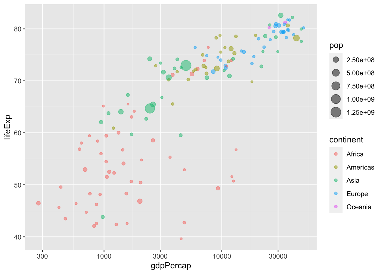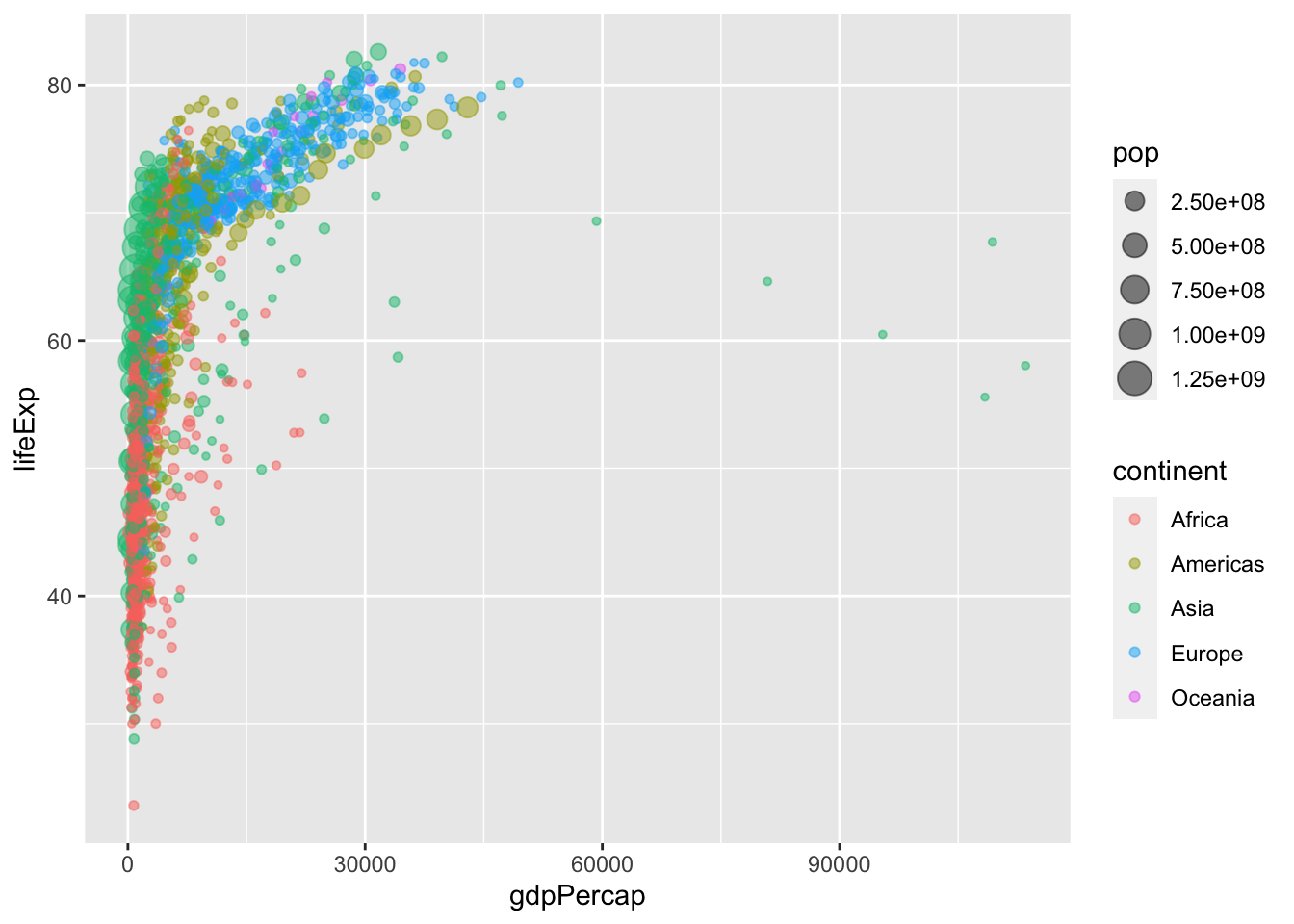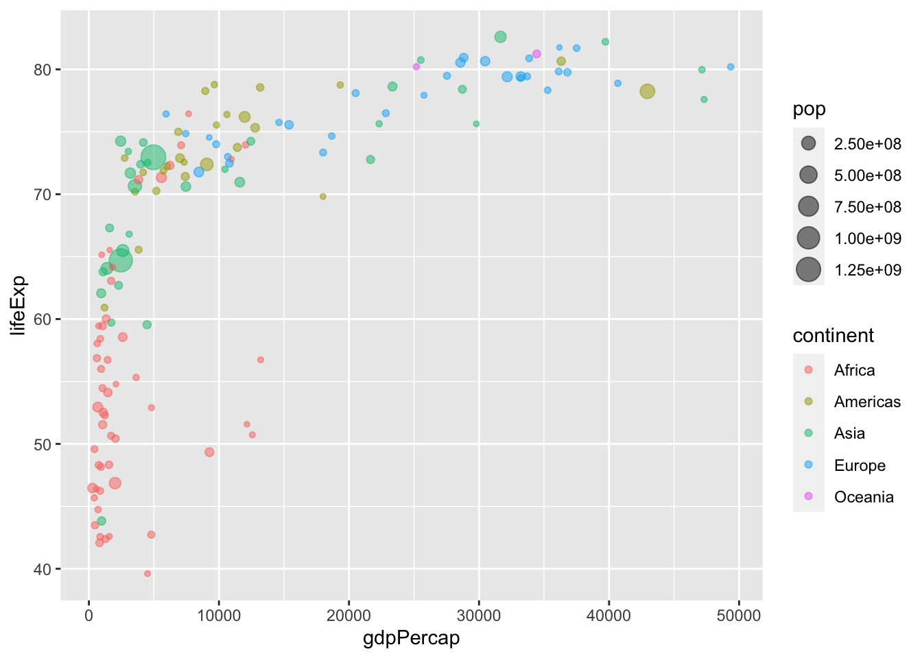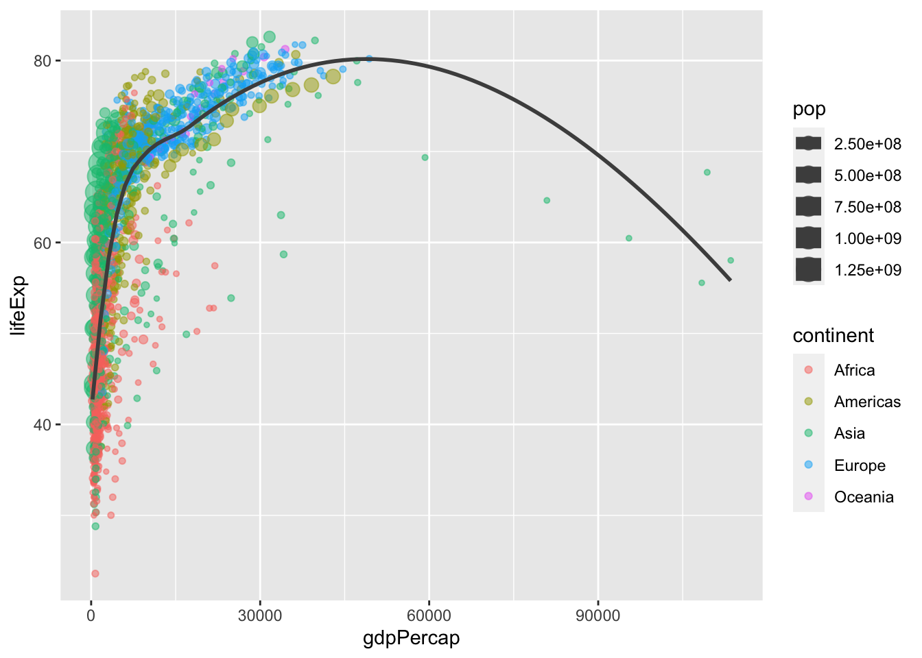 gapminder_2007 <- gapminder %>% filter(year == 2007)ggplot(gapminder_2007, aes(x = gdpPercap, y = lifeExp, color = continent, size = pop)) +