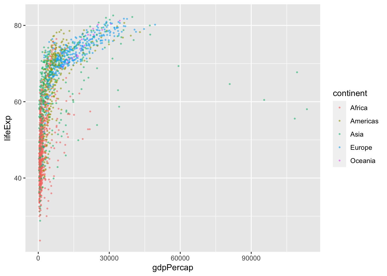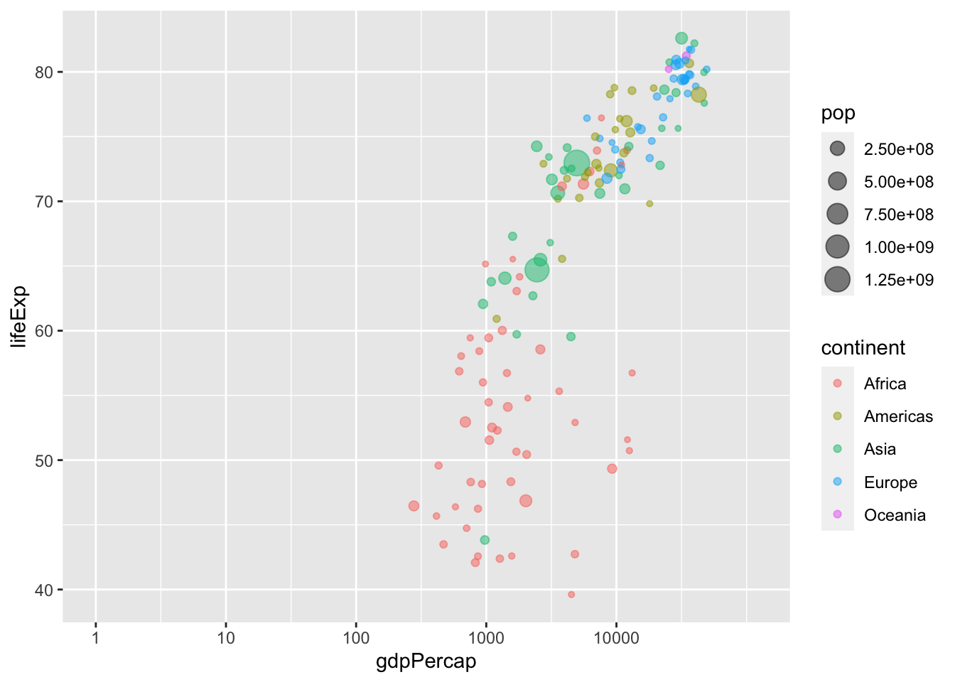 The scale of a plot describes the features of the space in which it is plotted. Arguably, it would be better to show gdpPercap on a logarithmic scale, rather than in its raw form. Fortunately, this is easy to do using a scale function, which can be considered another layer that transforms our plot.