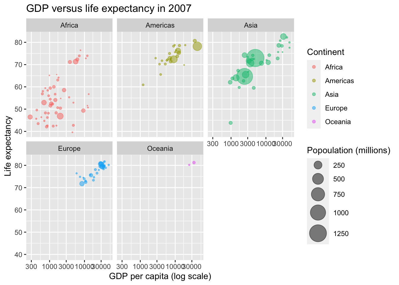 To remind you, this scatterplot showed GDP per capita against life expectancy for each country colored by continent and sized by population.