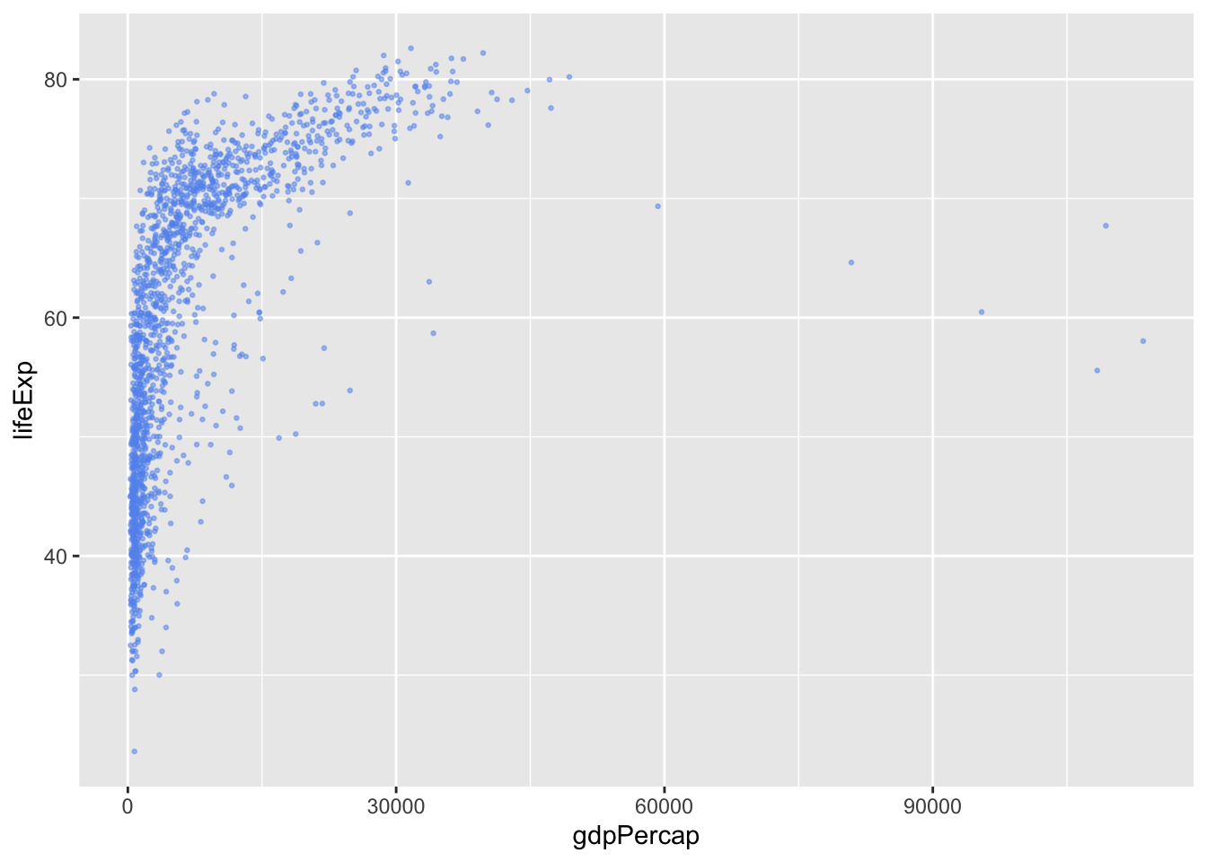 The output of this function is a grid with gdpPercap as the x-axis and lifeExp as the y-axis. However, we have not yet told ggplot what type of geometric object the data will be mapped to, so no data has been displayed.