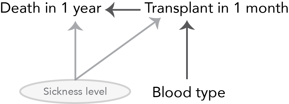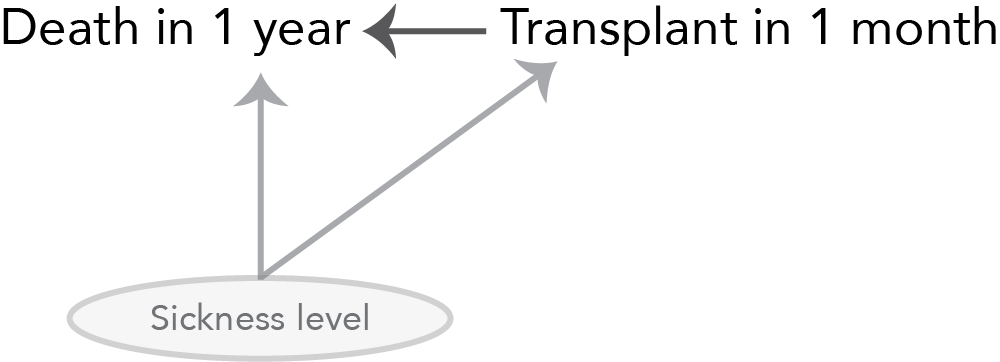 Our big question is whether there is an effect of being transplanted within one month (the treatment) on death within 1 year (the outcome). However, our standard approaches to estimating the treatment effect are foiled by the presence of unobserved confounding by sickness, a feature that we cannot accurately quantify. If we could accurately measure an individual’s level of sickness then we could adjust for it using regression adjustment or matching techniques. In our case, however, sickness is defined based on doctor intuition (an unmeasurable quantity), so these traditional approaches to dealing with confounding cannot help us.