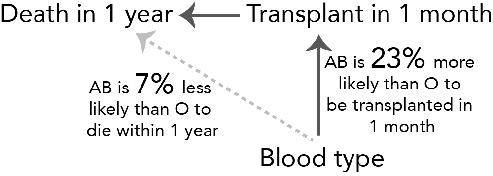 In our transplant setting, a particularly nice instrument is blood type. Patients with blood type AB can receive organs from donors with any blood type (and donors with blood type AB can only donate to recipients with blood type AB), whereas patients with blood type O can only receive organs from donors with blood type O (but donors with blood type O can donate to recipients of any blood type). The result is that patients with blood type O will, in general, need to wait longer for a transplant than patients of a similar sickness level with blood type AB.