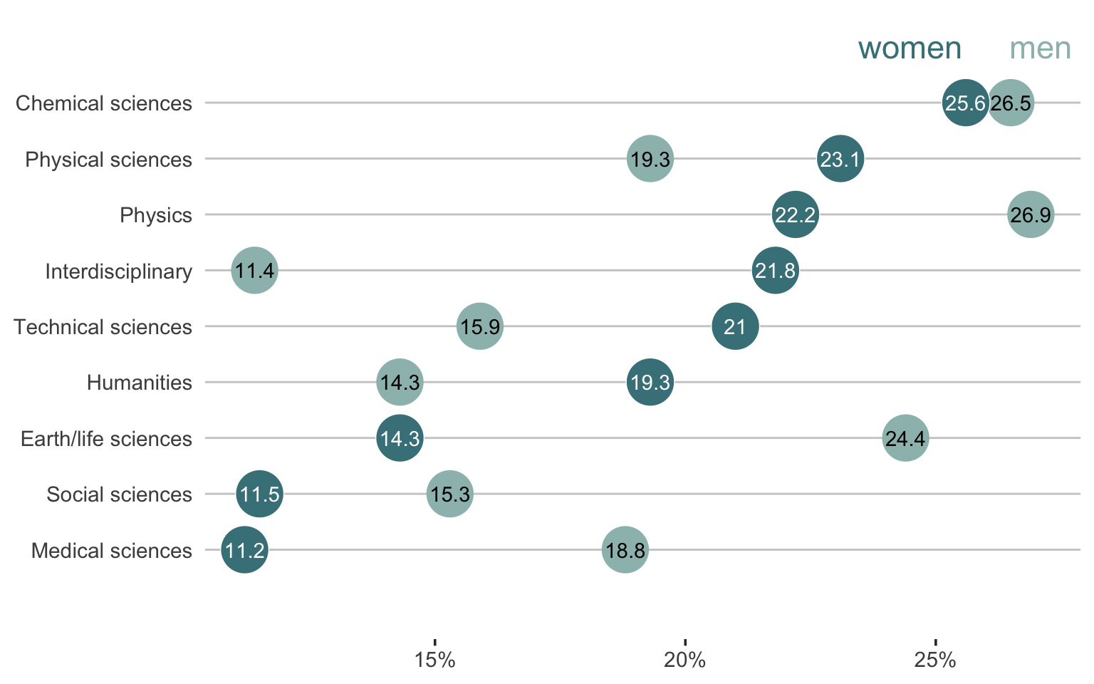Another alternative is the horizontal dot plot: In this case each discipline is again represented by a line, but instead of coding the success rates as the y-position at the end of the discipline slope, the success rate is coded as the x-position along the discipline-specific horizontal line. I have ordered the disciplines by the women’s funding success rate.